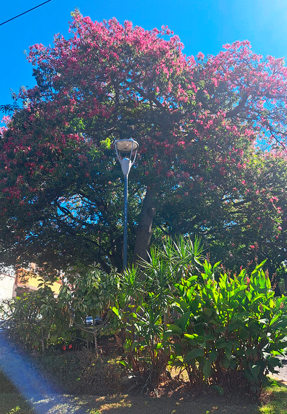 Hacia fines del verano y principios del otoño, las copas estallan en un fucsia vibrante y rosado. Las flores, con su centro blanco y cremoso, caen lentamente cubriendo las veredas y el cantero central, creando una alfombra natural que muchos vecinos evitan pisar para no romper el encanto.