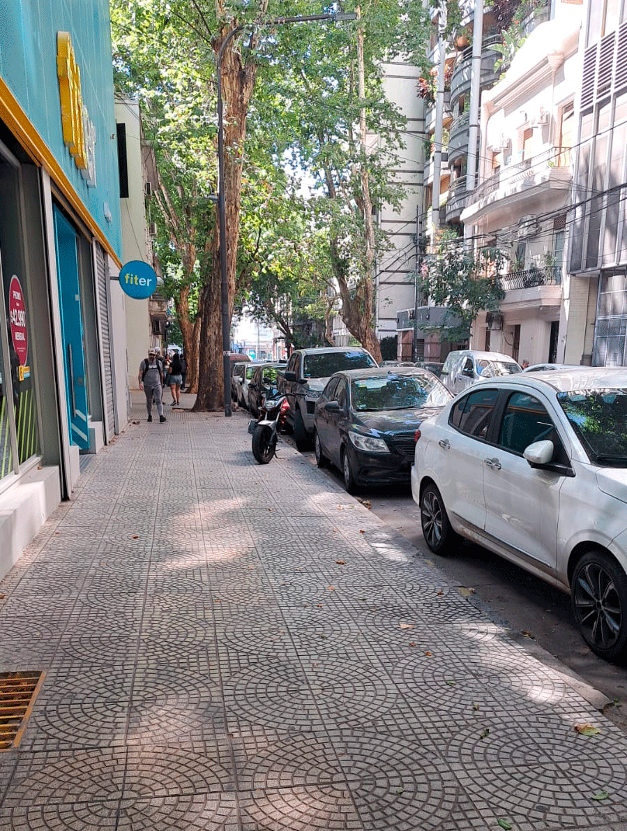 Cualquier vecino atento puede notar el patrón. En los frentes de los grandes locales —cadenas de electrodomésticos, bancos, indumentaria masiva— las veredas lucen impecables, con baldosas nuevas y rampas reglamentarias. Pero hay un detalle que se repite: no hay planteras. El cuadrado de tierra donde debería crecer un árbol ha sido prolijamente cementado y baldosado.