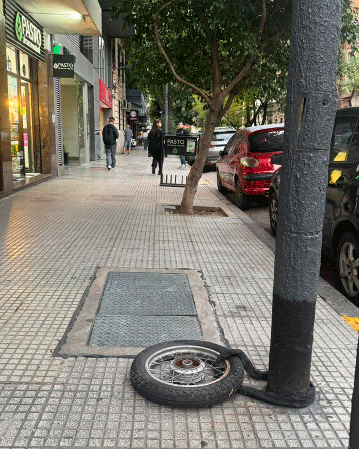 En la esquina de Falcón y Rivera Indarte, la inseguridad se manifiesta con una modalidad que expone la impunidad en las calles del barrio. Una rueda delantera atada con cadena y candado a un poste de luz es lo único que quedó de la moto de un vecino. Del resto del vehículo no hay rastros: se lo llevaron, dejando únicamente la rueda enganchada.